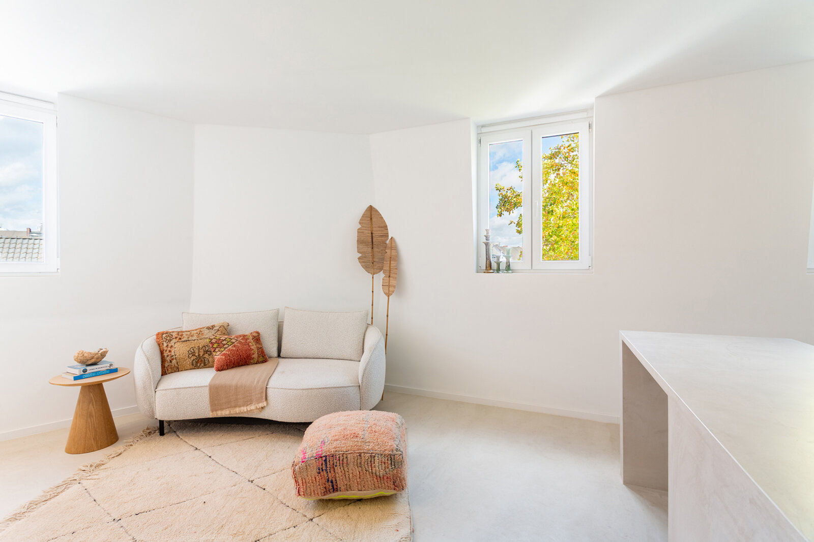 - Grote raampartijen zorgen voor een overvloed aan natuurlijk licht in zowel de leefruimte als de slaapkamer.