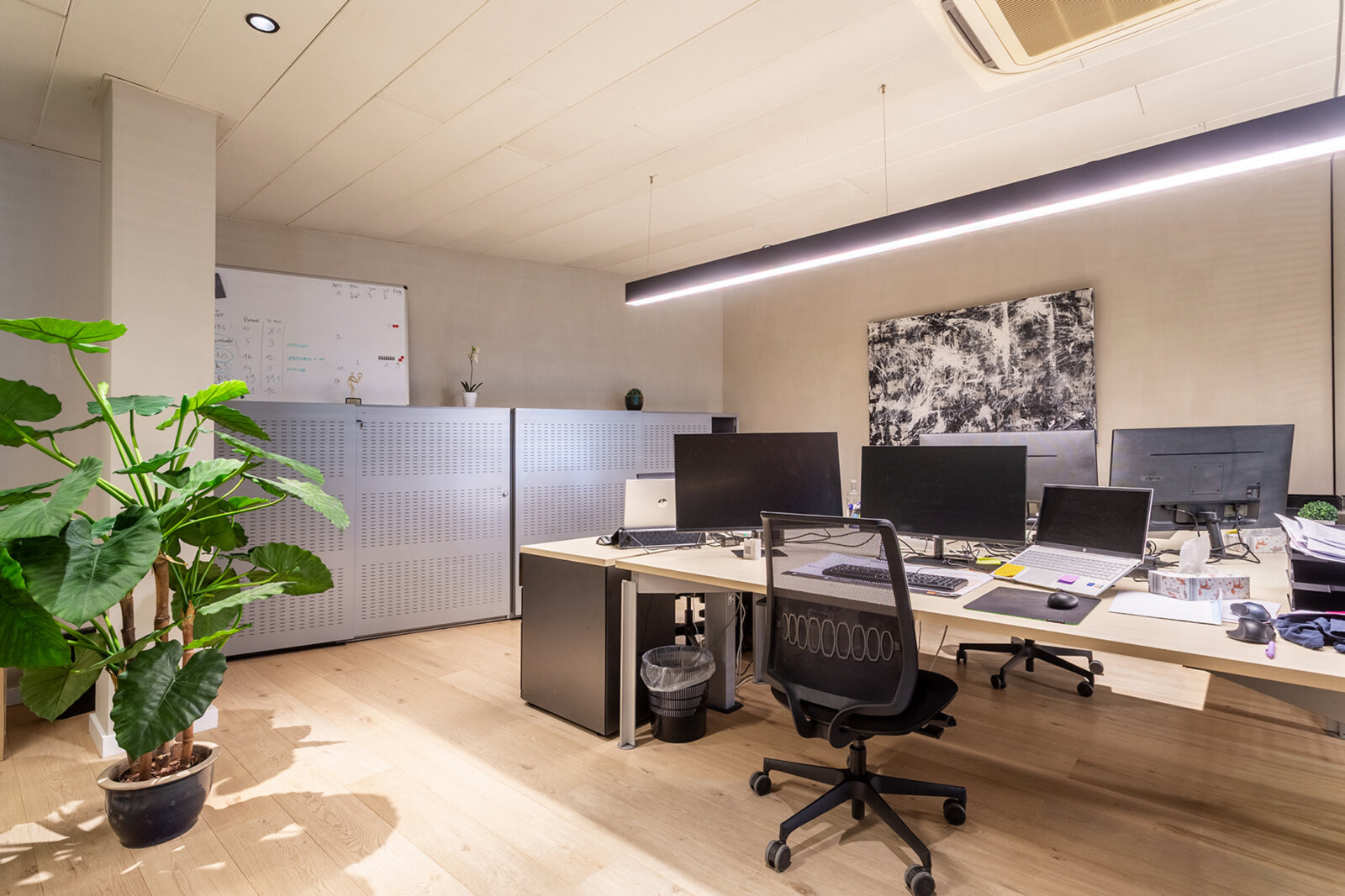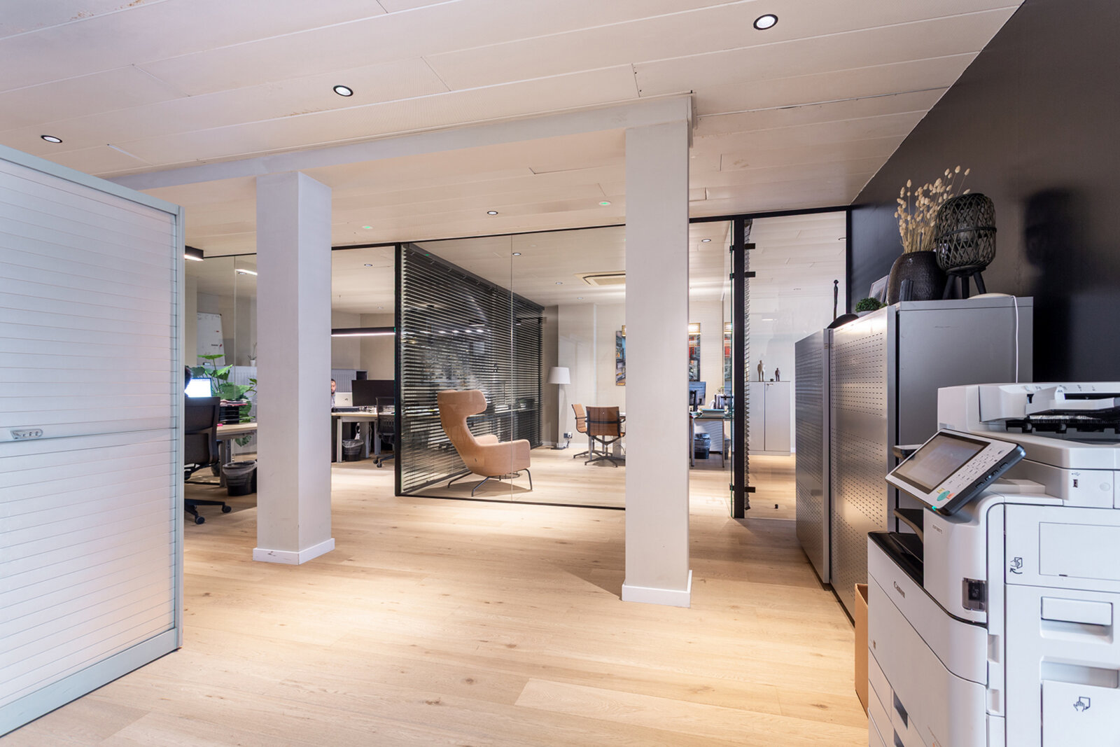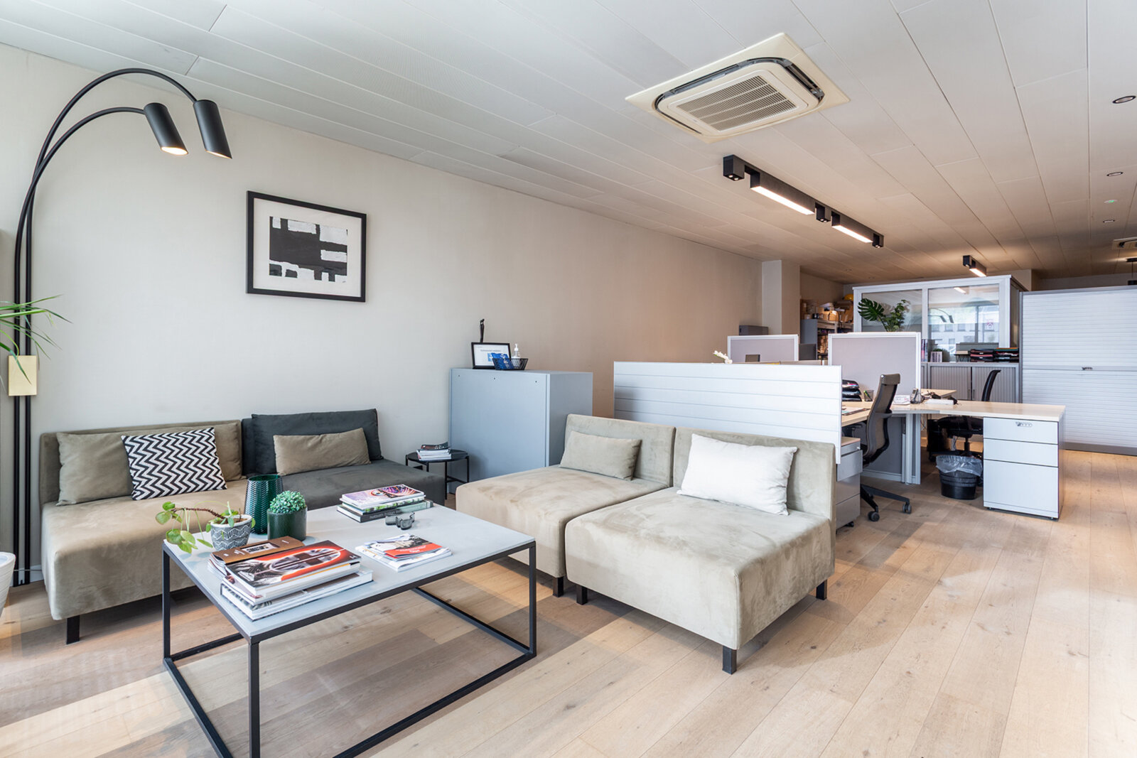 De gelijkvloerse kantoorruimte van circa 200 m² werd volledig vernieuwd en omvat een onthaalzone, open kantoorruimtes, een aparte vergaderzaal en sanitaire voorzieningen.